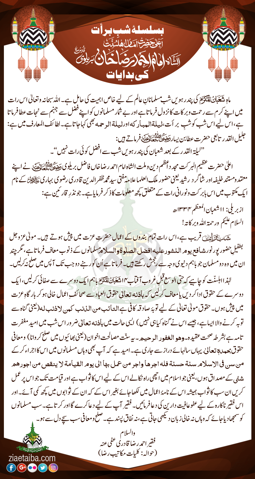 امام احمد رضا خان کی ہدایت بسلسلہ شب براءت